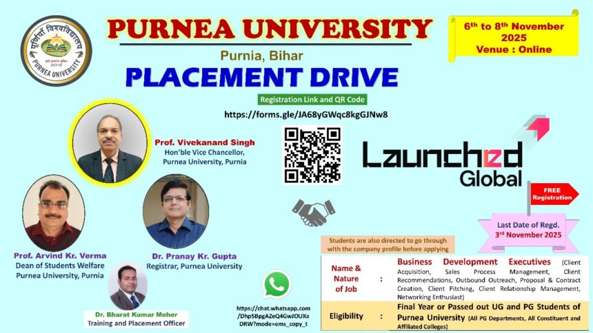पूर्णिया विश्वविद्यालय में तीन दिवसीय प्लेसमेंट ड्राइव सम्पन्न, 11 छात्रों को LaunchEd Global से रोजगार का अवसर