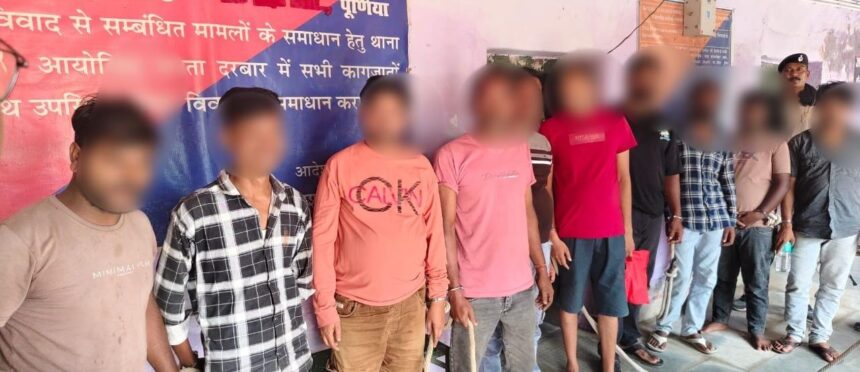 पूर्णिया: पूर्णिया जिले के मधुबनी थाना क्षेत्र में 17 अक्टूबर 2025 को गुप्त सूचना के आधार पर की गई छापेमारी में जुआ खेलते हुए कुल 10 लोगों को गिरफ्तार किया गया। पुलिस ने मौके से 5 ताश की गड्डियां, ₹42,380 नकद और 5 मोबाइल फोन भी जब्त किए हैं। गिरफ्तार अभियुक्तों की पहचान अजय कुमार (राजेन्द्र नगर), कुंदन कुमार राय, मकसूद अंसारी (ओली टोला), मोहम्मद इरफान (सिपाही टोला), कुणाल साह, गुड्डू राम (कोरठबारी), मो. छोटू अंसारी, मो. इश्तियाक, लालू अंसारी (थाना चौक, हाउसिंग बोर्ड), और मो. सोफिल (झुन्नी) के रूप में की गई है। सभी अभियुक्त पूर्णिया जिले के निवासी हैं। पुलिस द्वारा इस मामले में आगे की कानूनी कार्रवाई की जा रही है।