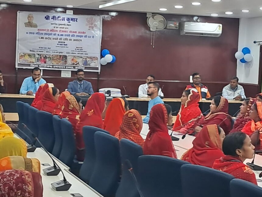 अररिया/प्रिंस कुमार : महिलाओं के आर्थिक सशक्तिकरण की दिशा में बड़ा कदम उठाते हुए मुख्यमंत्री नीतीश कुमार ने आज मुख्यमंत्री महिला रोजगार योजना के तहत प्रदेश की 10 लाख महिला लाभार्थियों के बैंक खातों में ₹10,000 प्रति लाभुक की दर से कुल ₹1,000 करोड़ की राशि हस्तांतरित की। वीडियो कॉन्फ्रेंसिंग के माध्यम से आयोजित इस राज्यव्यापी कार्यक्रम में अररिया जिले से परमान सभागार में जिला पदाधिकारी अनिल कुमार और बड़ी संख्या में लाभुक महिलाएं शामिल हुईं।