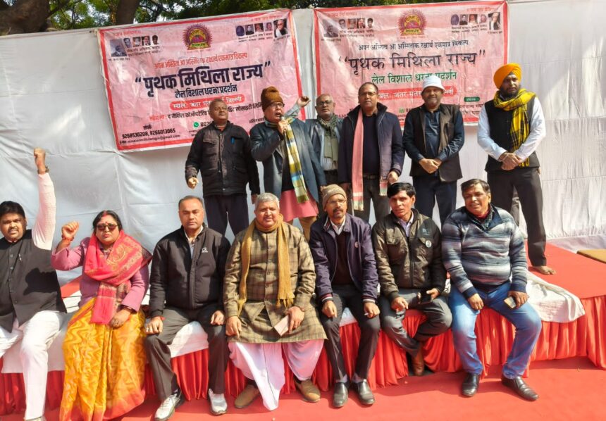 सहरसा, अजय कुमार: भारतीय संविधान अंतर्गत पृथक मिथिला राज्य निर्माण की मांग को लेकर अखिल भारतीय मिथिला राज्य संघर्ष समिति और मिथिला वासी के तरफ से जंतर मंतर दिल्ली पर मंगलवार को एकदिवसीय धरना-प्रदर्शन किया गया। तत्पश्चात ग्रेटर नोएडा संयोजक मदन कुमार झा के नेतृत्व में राष्ट्रपति, प्रधानमंत्री एवं गृह मंत्री को ज्ञापन दिया गया। प्रदर्शन का नेतृत्व अंतर्राष्ट्रीय संयोजक प्रोफेसर अमरेंद्र कुमार झा ने की। जिसमें सैकङों मैथिलों ने हिस्सा लिया। बाद में धरना की अध्यक्षता विनोद झा अध्यक्ष भारतीय महासंघ पार्टी और संचालन एडवोकेट मुकेश आनंद ने की। दूरभाष पर सम्बोधित करते हुये राष्ट्रीय अध्यक्ष डॉक्टर बैद्यनाथ चौधरी बैजू ने कहा कि सनातनी मिथिला को राज्य की मांग करते हुए 120 बरस हो गया।