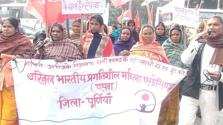 PURNIA NEWS,अभय कुमार सिंह : एपवा द्वारा सोमवार को राष्ट्रव्यापी विरोध मार्च निकाला, इसी के तहत रुपौली प्रखंड मुख्यालय में भी एपवा द्वारा विरोध मार्च निकाला गया। जिसकी अगुवाई एपवा की जिला संयोजक कां सुलेखा देवी और संगीता देवी कर रही थीं । मार्च खादी भंडार से निकल कर ब्लांक रोड,नया बाजार होते हुए थाना चौक पर सभा में तब्दील हो गया। इस सभा को सम्बोधित करते हुए कां सुलेखा देवी ने कहा कि 15 दिसंबर को बिहार के मुख्यमंत्री एक महिला को नियूक्ति पत्र देने के दौरान सरेआम उसका नकाब खींचना बेहद शर्मनाक घटना है।यह उस डाक्टर महिला के धार्मिक पहचान और संवैधानिक अधिकार पर हमला है। एपवा इस घटना की कड़ी निंदा करती है। उन्होंने मांग की कि महिला डाॅक्टर का नकाब खींचने वाले बिहार के मुख्यमंत्री नीतीश कुमार मांफी मांगें, धार्मिक पहचान पर हमला बंद करो, हर स्त्री का अपमान नहीं, सम्मान करो, गिरिराज सिंह जैसे नफरती समाज के लिए कलंक इस्तीफा दो।