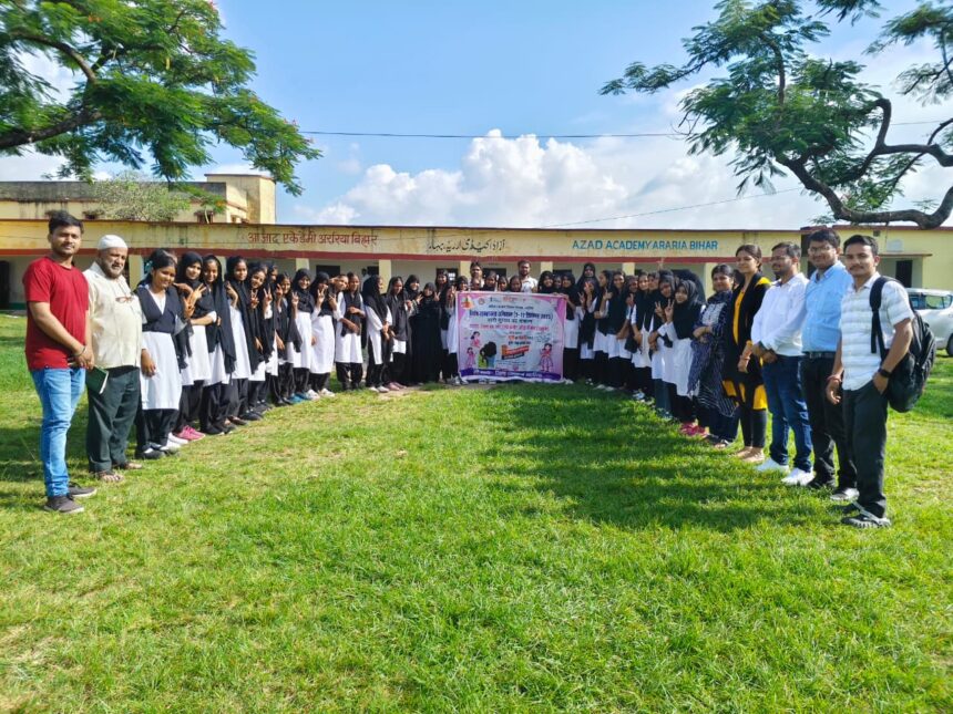 ARARIA NEWS,प्रिंस(अन्ना राय) : अररिया जिला अंतर्गत +2 हाई स्कूल आजाद एकेडमी में महिला एवं बाल विकास निगम द्वारा संचालित मिशन शक्ति योजना के तहत एक विशेष जागरूकता अभियान चलाया जा रहा है। इसी के तीसरे दिन, संकल्प: हब फॉर एंपावरमेंट ऑफ वीमेन द्वारा जेंडर संवेदीकरण विषय पर एक जागरूकता कार्यक्रम का आयोजन किया गया।इस कार्यक्रम में छात्राओं को सरकार द्वारा महिलाओं और किशोरियों के लिए चलाई जा रही विभिन्न योजनाओं की विस्तृत जानकारी दी गई। इनमें माहवारी स्वच्छता, बेटी बचाओ बेटी पढ़ाओ, बाल विवाह रोकथाम, PCPNDT Act (गर्भधारण पूर्व एवं प्रसव पूर्व निदान तकनीक), POSH, लैंगिक भेदभाव पर रोक, दहेज रोकथाम जैसे महत्वपूर्ण विषय शामिल थे।