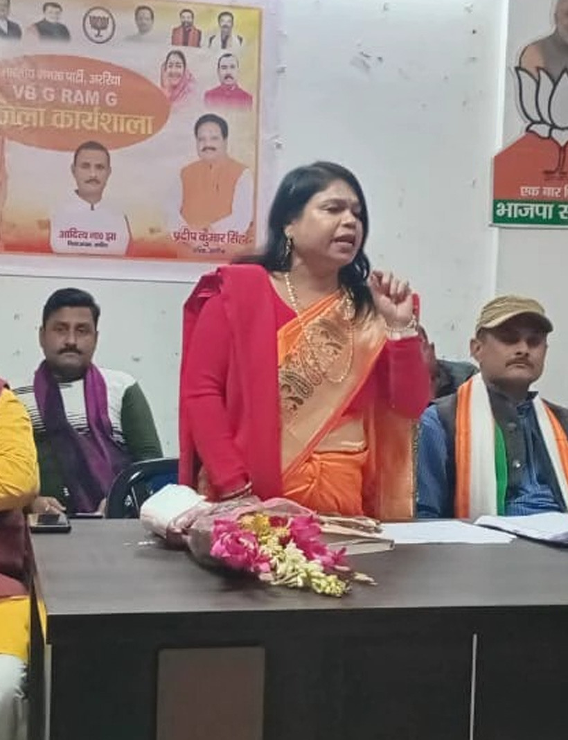 अररिया: भाजपा जिला कार्यालय में मंगलवार को ‘जी रामजी’ (G RAMJI) विषय को लेकर जिला स्तरीय कार्यशाला का आयोजन किया गया. पार्टी के जिलाध्यक्ष आदित्य नारायण झा की अध्यक्षता में आयोजित इस बैठक में मुख्य अतिथि के रूप में भाजपा प्रदेश उपाध्यक्ष अनामिका पासवान उपस्थित रहीं.