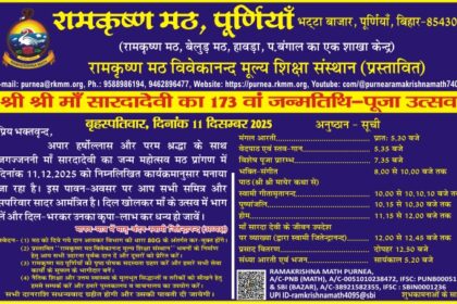 पूर्णिया में माँ सारदा देवी की 173वीं जयंती: 11 दिसंबर को रामकृष्ण मठ में भव्य पूजा-आरती-प्रसाद, सभी सादर आमंत्रित