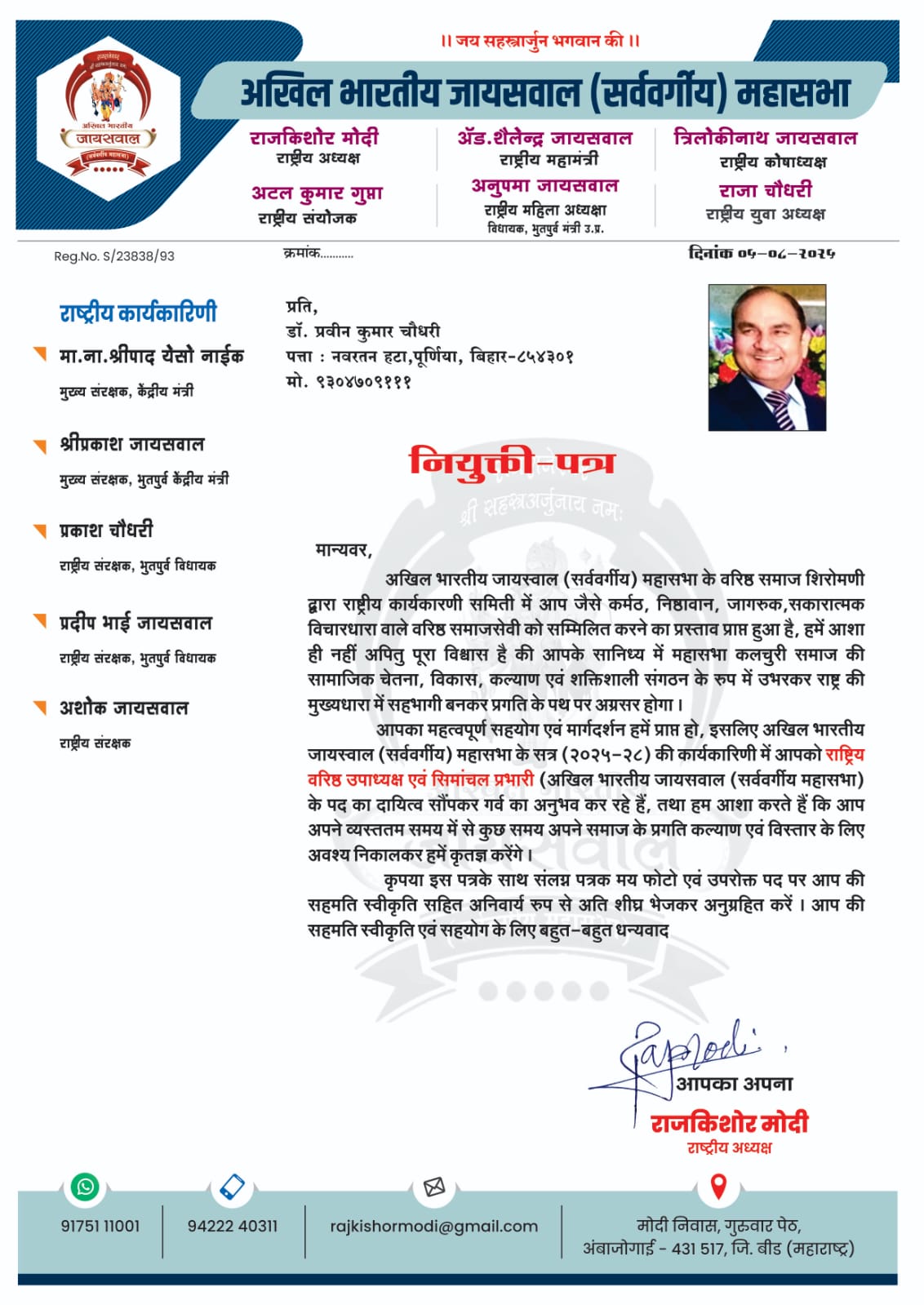 सीमांचल के गौरव बने डॉ. प्रवीण कुमार चौधरी, अखिल भारतीय जायसवाल महासभा में मिली बड़ी जिम्मेदारी