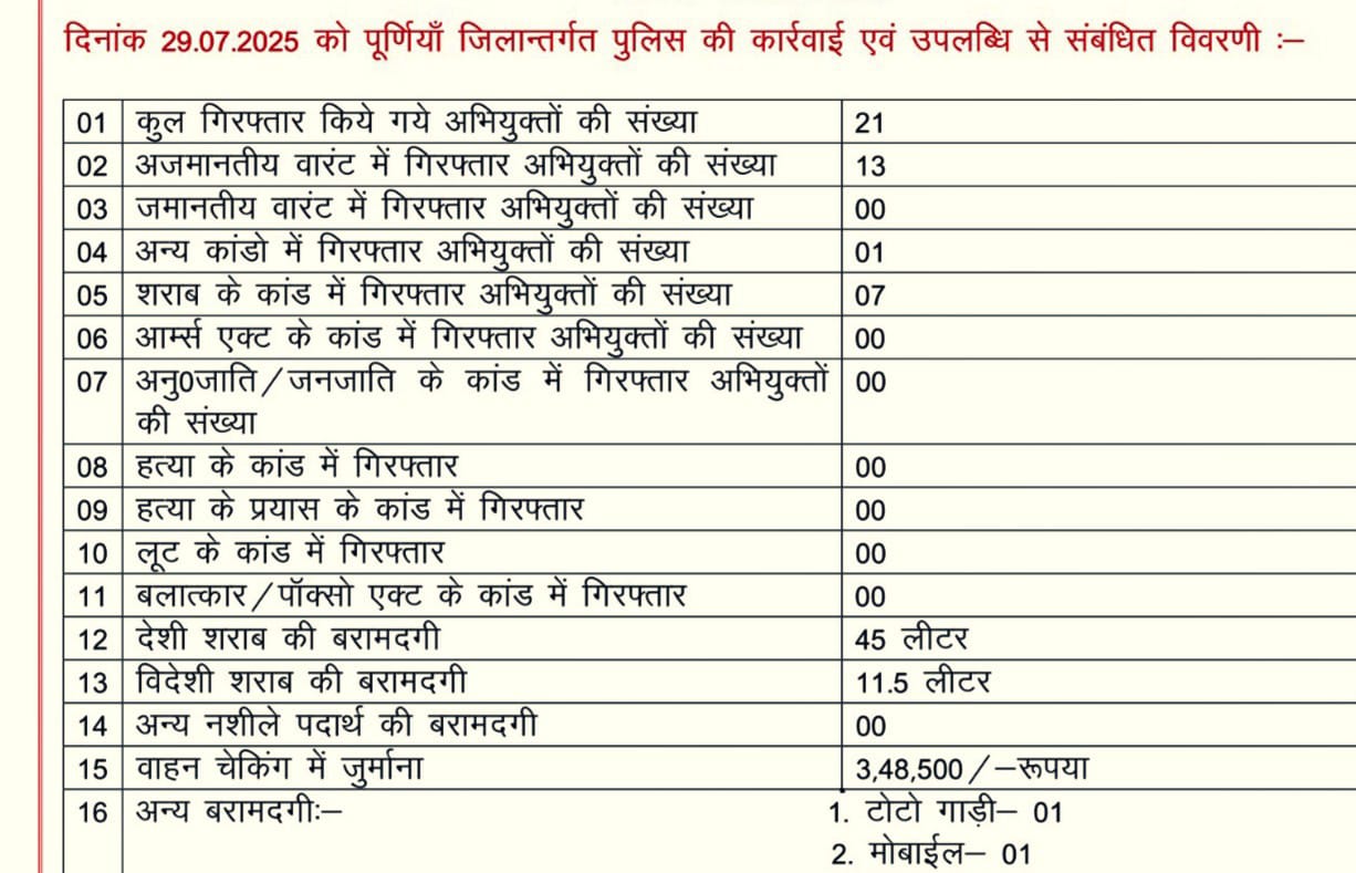 PURNIA NEWS : पूर्णिया पुलिस की कार्रवाई – एक दिन में 21 अभियुक्त गिरफ्तार, भारी जुर्माना व शराब बरामद