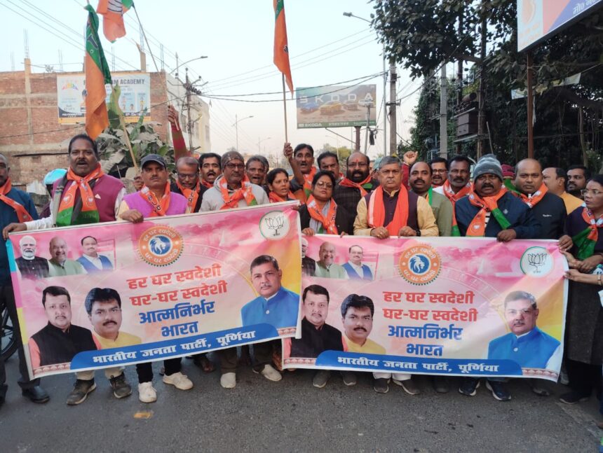 PURNIA NEWS : पूर्णिया विधानसभा अंतर्गत नगर मंडल पश्चिम भाग के मधुबनी में भारतीय जनता पार्टी द्वारा “घर-घर स्वदेशी, हर घर स्वदेशी” अभियान के तहत भव्य स्वदेशी जागरूकता पदयात्रा का आयोजन किया गया। यह पदयात्रा मधुबनी थाना चौक से प्रारंभ होकर मधुबनी बाजार तक निकाली गई, जिसमें बड़ी संख्या में भाजपा कार्यकर्ताओं के साथ पूर्णिया विधायक विजय खेमका ने सक्रिय रूप से भाग लिया। पदयात्रा के दौरान दुकानदारों एवं आम नागरिकों के बीच “स्वदेशी अपनाओ, भारत को आत्मनिर्भर बनाओ” संदेश वाले पत्रक वितरित किए गए। कई प्रतिष्ठान मालिकों ने अपने-अपने दुकानों पर स्वदेशी के समर्थन में स्टीकर एवं बैनर लगाए, जिससे बाजार में उत्साह और जागरूकता का माहौल देखने को मिला।