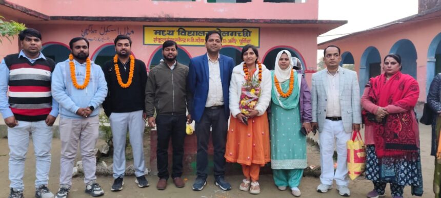 मध्य विद्यालय बेलगच्छी के शिक्षक एवं छात्र-छात्राओं ने गमगीन आंखों से शिक्षकों को दी विदाई