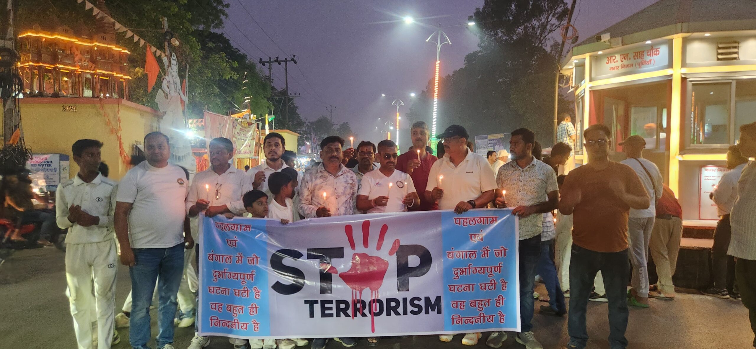 विजय शंकर सिंह, सुरेंद्र कुमार सरोज, नवीन सिंह, डॉ. आलोक कुमार, शशांक शेखर सिंह उर्फ गुड्डू सिंह, कृष्ण कुमार, नंदकिशोर सिंह, पंकज श्रीवास्तव, अनिल लोहिया, आलोक लोहिया, सुमन सिंह, तौफीक आलम, आलोक केडिया, इंद्रजीत साह, दिलीप तिवारी, रूबी सिंह, रूबी सेठिया, अरविंद झा, भूषण यादव, जॉनी यादव, मनीष सिंह, नरेश पारिख, हरिओम झा, प्रमोद यादव, अभिनव केजरीवाल, सुनील भंसाली, मुरारी सिंह, निशित, जय सिंह, आदित्य कर्ण, परिमल सिंह, राजीव सिंह, आतिश सनातनी, पवन पोद्दार, प्रणव कुमार और राहुल राज। सभी वक्ताओं और प्रतिभागियों ने एक स्वर में आतंकवाद के खिलाफ सख्त कार्रवाई की मांग की और देश की अखंडता, शांति और एकता के प्रति अपनी अटूट निष्ठा जताई। मोमबत्तियों की लौ के साथ शांतिपूर्वक निकाला गया यह मार्च, पूर्णिया की जनता की जागरूकता और मानवता के प्रति प्रतिबद्धता का प्रतीक बन गया। आयोजकों ने कहा कि ऐसी घटनाएं देश को झकझोरती हैं, लेकिन साथ ही हमें एक साथ खड़े होकर यह दिखाने का अवसर भी देती हैं कि भारत कभी आतंक के सामने नहीं झुकेगा।