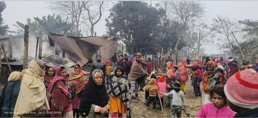 पूर्णिया, विमल किशोर: अमर थाना क्षेत्र के आमगाछी पंचायत वार्ड नंबर 9, गड़हरा गांव में बीती रात करीब 10:25 बजे अचानक लगी आग ने 6 परिवारों के घर पूरी तरह नष्ट कर दिए। प्रभावित परिवारों के अनुसार इस घटना में लगभग 5 लाख रुपये से अधिक की संपत्ति जलकर राख हो गई, जिसमें घर का अनाज, बर्तन, कपड़े, फर्नीचर, नगद, जेवर और जमीन के कागजात शामिल हैं। पीड़ितों में नुजहत, फातमा, बानो, जहानों, आदिल और आबिद के घर भी प्रभावित हुए। आग इतनी तेजी से फैली कि कुछ भी बचाया नहीं जा सका।
