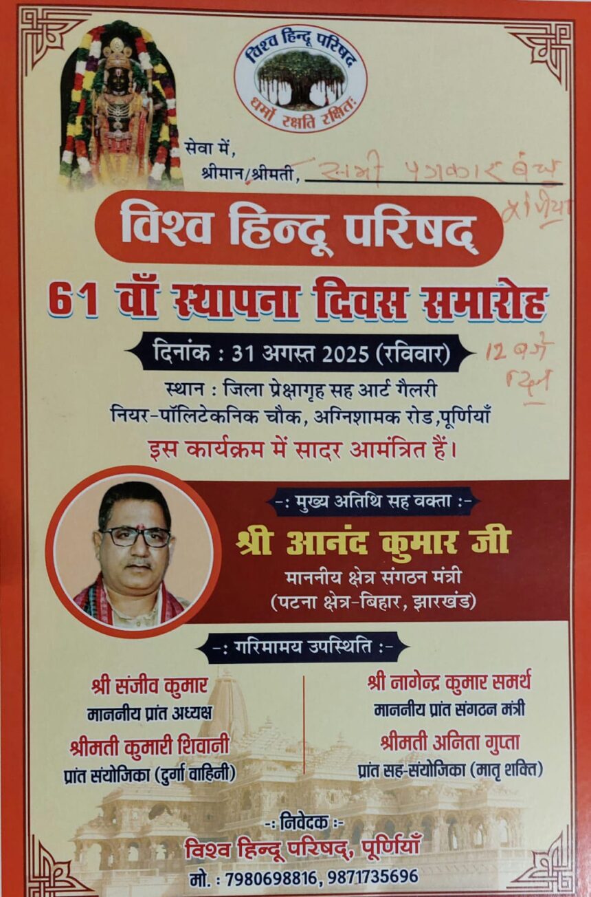 PURNIA NEWS : विश्व हिन्दू परिषद् (VHP) का 61वां स्थापना दिवस समारोह आगामी 31 अगस्त 2025 (रविवार) को पूर्णियाँ शहर में धूमधाम से मनाया जाएगा। यह कार्यक्रम दोपहर 12 बजे से जिला प्रेक्षागृह सह आर्ट गैलरी, जो पॉलिटेकनिक चौक के पास स्थित है, में आयोजित किया जाएगा। सभी पत्रकारों को सादर आमंत्रित किया गया है। समारोह में मुख्य अतिथि के रूप में आनंद कुमार जी, माननीय क्षेत्र संगठन मंत्री (पटना क्षेत्र – बिहार, झारखंड) उपस्थित रहेंगे।