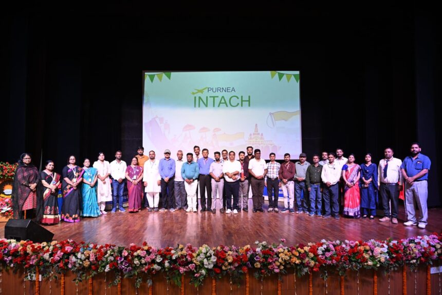 PURNIA NEWS : पूर्णिया के विद्या विहार आवासीय विद्यालय, परोरा स्थित रविवंश नारायण स्मारक सभागार में इंटेक पूर्णिया चैप्टर द्वारा आयोजित “इंटेक नेशनल हेरिटेज क्विज़ 2025” का सिटी लेवल राउंड बड़े उत्साह और गरिमा के साथ सम्पन्न हुआ। प्रतियोगिता को लेकर विद्यार्थियों में गजब का उत्साह देखने को मिला और पूरे कार्यक्रम का सीधा प्रसारण फेसबुक, यूट्यूब समेत कई डिजिटल प्लेटफॉर्म्स पर किया गया। मुख्य अतिथि के रूप में एडीएम (लॉ एंड ऑर्डर) राजकुमार गुप्ता उपस्थित थे, जबकि क्विज़ मास्टर की भूमिका राष्ट्रीय स्तर के प्रख्यात क्विज़र एवं लेखक श्री समीरन मोंडल ने निभाई। कार्यक्रम का संचालन इंटेक हेड ऑफिस दिल्ली और पूर्णिया चैप्टर के संयोजक इंजीनियर राजेश चंद्र मिश्र के मार्गदर्शन में हुआ। इस प्रतियोगिता में 18 विद्यालयों से 126 टीमों ने भाग लिया और प्रारंभिक लिखित परीक्षा से लेकर मंचीय राउंड तक कई रोचक मुकाबलों के बाद विजेताओं की घोषणा की गई।