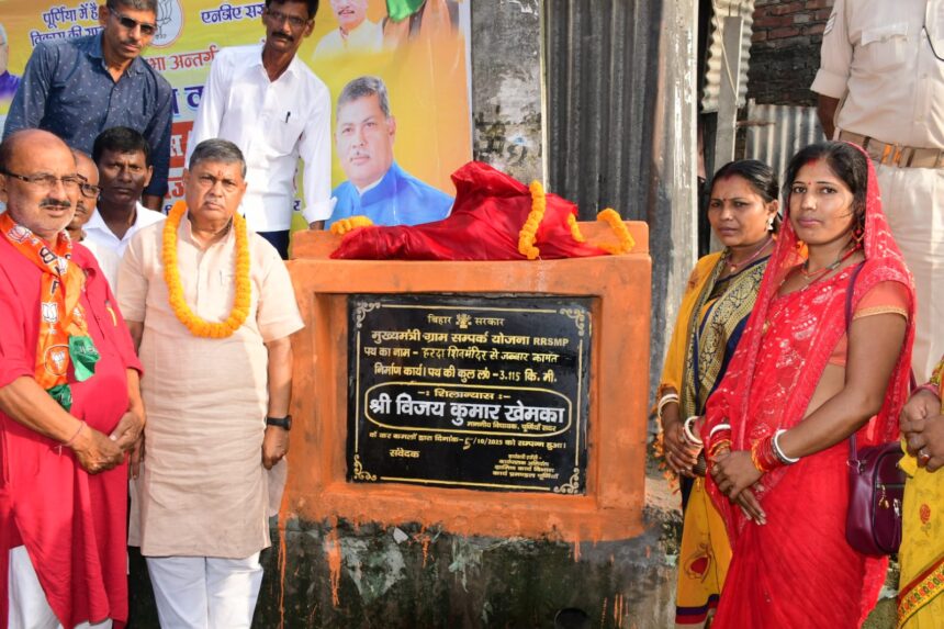 PURNIA NEWS : पूर्णिया विधानसभा क्षेत्र में रविवार को विकास कार्यों की एक लंबी श्रृंखला का शुभारंभ हुआ। हरदा शिव मंदिर चौक पर आयोजित भव्य कार्यक्रम में विधायक विजय खेमका ने ग्रामीण कार्य विभाग की 16 सड़कों एवं नगर निगम क्षेत्र अंतर्गत मुख्यमंत्री शहरी समग्र योजना के तहत बनने वाली 59 सड़कों का संयुक्त रूप से शिलान्यास किया। इस अवसर पर बड़ी संख्या में कार्यकर्ता और स्थानीय नागरिक मौजूद रहे।