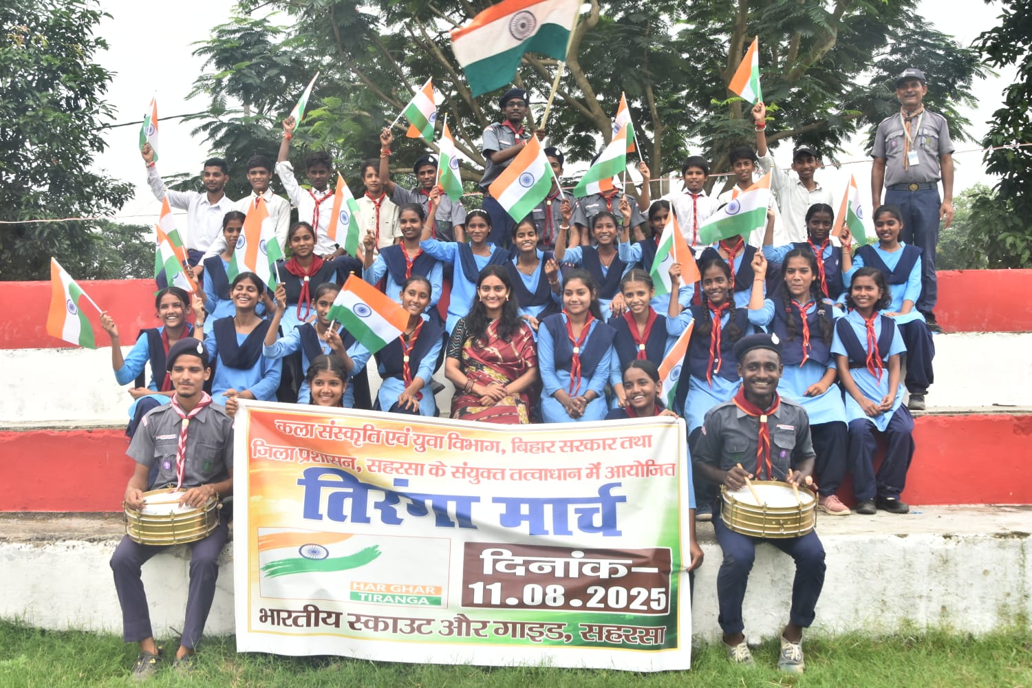 कला संस्कृति एवं युवा विभाग तथा जिला प्रशासन सहरसा के संयुक्त तत्वाधान में 8 अगस्त से लगातार 15 अगस्त तक ” हर घर तिरंगा ” अभियान मनाया जा रहा है । इसी अभियान के तहत आज जिला कला संस्कृति पदाधिकारी स्नेहा कुमारी के अगुवाई में सहरसा स्टेडियम में भारतीय स्काउट एवं गाइड के बच्चों के बीच तिरंगा मार्च का आयोजन किया गया है ।उक्त अवसर पर भारतीय स्काउट गाइड सहरसा के रवि सर और आनंद झा शिक्षक मौजूद रहे । स्नेहा कुमारी ने बताया कि इसी सप्ताह में सांस्कृतिक कार्यक्रम, तिरंगा पेंटिंग कार्यशाला सहित अन्य कार्यशाला आयोजित की जाएगी ।