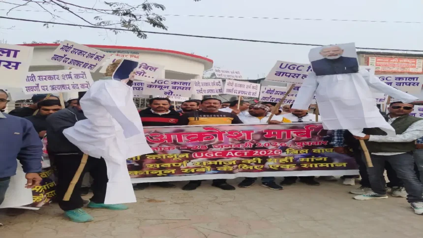 पूर्णिया: UGC Equity in HEI Act 2026 के प्रावधानों के विरोध में बुधवार को पूर्णिया में विभिन्न सामाजिक संगठनों, छात्रों और युवाओं ने एकजुट होकर व्यापक प्रदर्शन किया। आस्था मंदिर से वीर कुंवर सिंह स्मारक तक पैदल मार्च निकालते हुए प्रदर्शनकारी आर.एन. शाह चौक पहुंचे, जहां प्रधानमंत्री और गृहमंत्री का पुतला दहन कर सरकार के प्रति नाराजगी जताई गई।