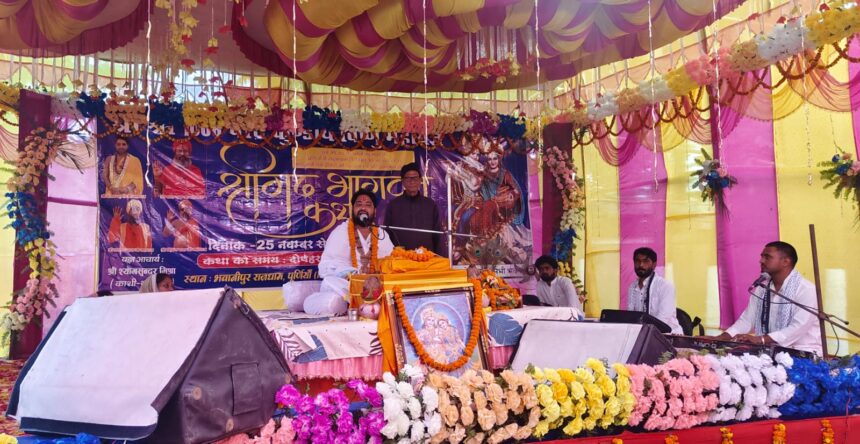 पूर्णिया, आनंद यादुका : भवानीपुर प्रखंड मुख्यालय स्थित अति प्राचीन सार्वजनिक श्रीराम जानकी ठाकुरबाड़ी में नौ दिवसीय श्रीविष्णु महायज्ञ एवं श्रीमद्भागवत कथा के आयोजन से समूचे भवानीपुर में भक्ति की बयार बह रही है । राजस्थान, हरिद्वार, अयोध्या, बनारस एवं अन्य जगहों से पहली बार भवानीपुर पहुंचे दो सौ से ज्यादा साधुओं के पधारने मात्र से भवानीपुर नगर पंचायत का माहौल आध्यत्मिक बना हुआ है । गुरुवार को श्रीमद्भागवत कथा के पावन मौके पर पहुंचे हजारों श्रद्धालुओं को प्रवचन देते हुए राजस्थान से पधारे प्रकांड भगवद कथा वाचक श्री संजय कृष्ण जी महाराज ने कहा कि आज हमारा समाज अपने भारतीय वैदिक रीति रिवाजों से विमुख होकर पश्च्यात संस्कृति को अपना रहा है , जबकि पश्च्यात संस्कृति के लोग हमारी लाखो बर्ष पुरानी वैदिक संस्कृति को अपना रहे हैं । उन्होंने कहा कि हमारे समाज मे जितनी भी वकृति पैदा हुई है वह सिर्फ दिखावे के वजह से और अपनी सनातन वैदिक संस्कृति को छोड़ने से हुआ है ।