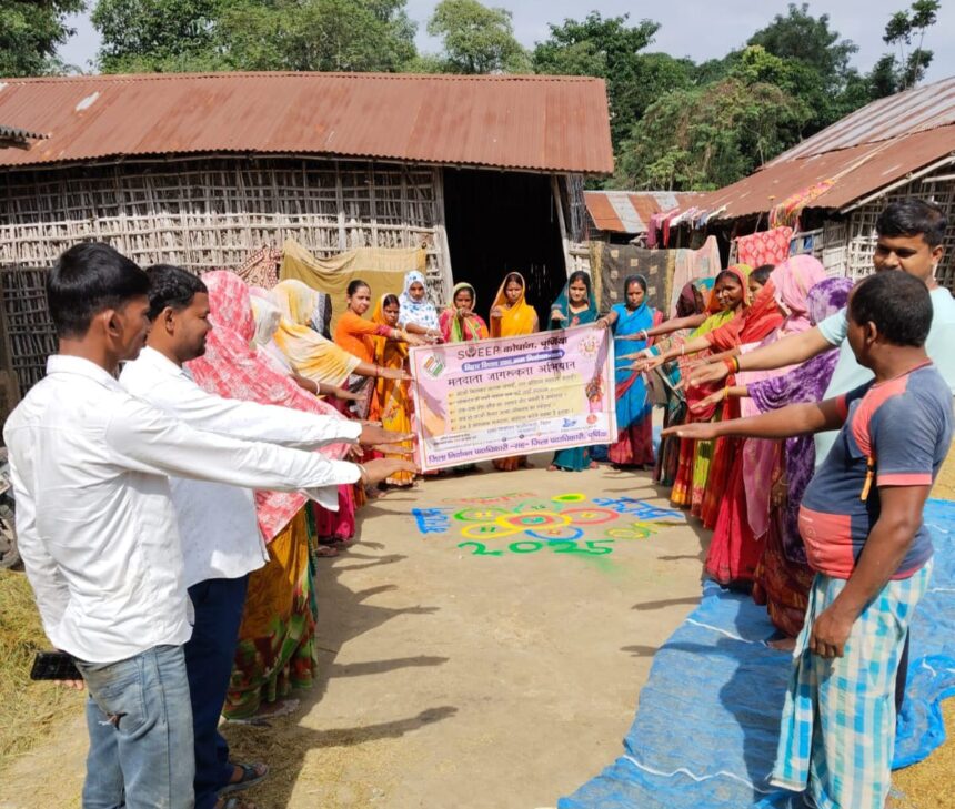 Bihar Election 2025 : बिहार विधानसभा आम निर्वाचन 2025 को लेकर मतदाता जागरूकता अभियान के तहत बायसी प्रखंड के खपरा पंचायत के चौनी ग्राम में जीविका द्वारा विशेष कार्यक्रम आयोजित किया गया। जिला निर्वाचन पदाधिकारी अंशुल कुमार के दिशा-निर्देश में चल रही स्वीप गतिविधियों के अंतर्गत डीपीएम जीविका की अगुवाई में आंचल नारी CLF के खुशबू ग्राम संगठन द्वारा शपथ ग्रहण, प्रभात फेरी, रंगोली निर्माण और मतदाता जागरूकता कार्यक्रम आयोजित किया गया।