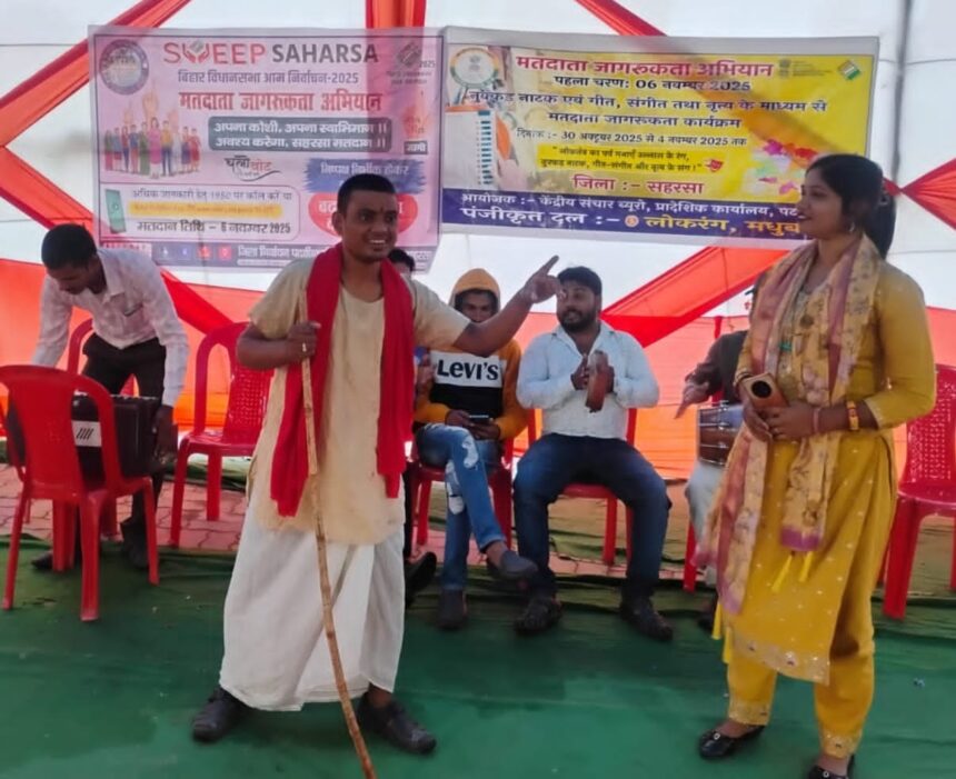 Bihar Election 2025,अजय कुमार : भारत सरकार, सूचना एवं प्रसारण मंत्रालय के केन्द्रीय संचार ब्यूरो (सी.बी.सी.), पटना में पंजीकृत सांस्कृतिक दल लोग रंग मधुबनी के कलाकारों ने शुक्रवार को रेलवे स्टेशन, सहरसा में गीत, संगीत एवं नुक्कड़ नाटक के माध्यम से आगामी विधानसभा चुनाव में अधिक से अधिक संख्या में मतदान करने के लिए लोगों को प्रेरित किया।स्वीप कोषांग, सहरसा के दिशानिर्देश पर आयोजित इस मतदाता जागरूकता कार्यक्रम में हर दिन लोगों की भारी भीड़ उमड़ी रही है और लोगों में मतदान के प्रति जिज्ञासा काफी बढ़ रहा है। पहले मतदान फिर जलपान की बात करते हुए सांस्कृतिक दल के कलाकारों ने अपने गीत, संगीत एवं नुक्कड़ नाटक के माध्यम से उपस्थित लोगों को लोकतंत्र में मतदान के महत्व को समझाते हुए आगामी 6 नवम्बर को अपने- अपने मतदान केंद्र पर पहुँच कर अत्यधिक संख्या में मतदान करने की अपील की।